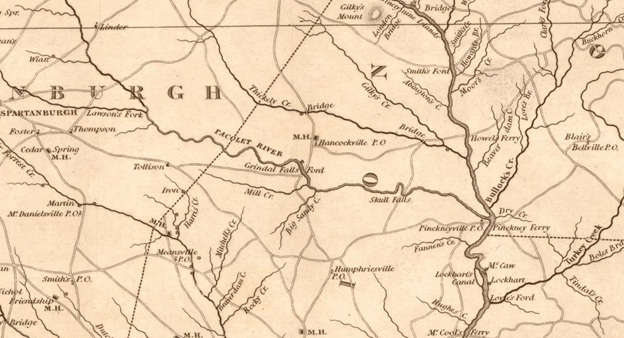 In pursuit of that end, the Loyalist region that we shall be exploring is perhaps one of the most complex and challenging areas for historians to fit into the accepted narrative. The region is located west of fertile coastal lands of South Carolina, an area that was on the periphery of colonial society. A land that was thought to have been of little consequence apart from a buffer zone between the wealthy plantations on the coast and the unruly aboriginal tribes that made their home on the western side of Appalachia. Narrowing our focus further, we observe an unassuming community spread out along the numerous streams around the confluence of the Pacolet and Broad Rivers. Located northeast of modern-day Jonesville South Carolina, the Grindal Shoals community was situated on a strategic ford that crossed the Pacolet River and was heavily used by both sides during the Revolution as the various partisans traversed the region leaving desolation in their wake.