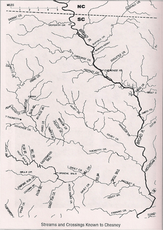 That December, Chesney was placed in command of the militia guard at the jail of Ninety-Six. With the arrival of Tarleton’s British Legion in January of 1781, Chesney was ordered to be a scout and guide during Tarleton’s race to catch Gen. Morgan. Upon entering the Grindal Shoals area, he observes the old camps of Gen. Morgan’s army. He then proceeded to his father’s house, where he was told that Morgan had gone to the “old fields about an hour before.”[51] Chesney then rushed to intercept Tarleton and found him to the north at the head of Thicketty Creek, which was Morgan’s last campsite. Upon making contact with Gen. Morgan’s mixed force consisting of militia with a small contingent of regulars at a place known as the Cowpens, Chesney sardonically comments that “we suffered a total defeat by some dreadful bad management.”[52]